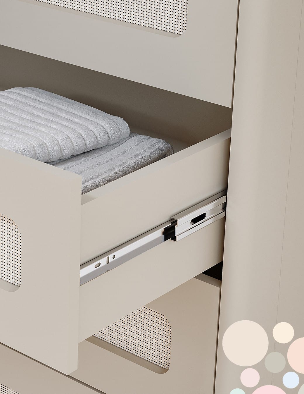 Organização e beleza que toda mamãe precisa para o quarto do bebê se encontram no Roupeiro Biscoito da Permobili Baby! Com puxadores torneados em madeira e detalhes em baixo relevo, cada gaveta é um convite para um mundo de praticidade. Com dobradiças 35mm Slow Motion, as portas se fecham suavemente, sem nenhum barulho que possa perturbar o sono do pequeno. E o espaço interno? Simplesmente incrível! Tudo para guardar com carinho todas as roupinhas e roupa de cama do bebê. 1480mm 2180mm 473mm