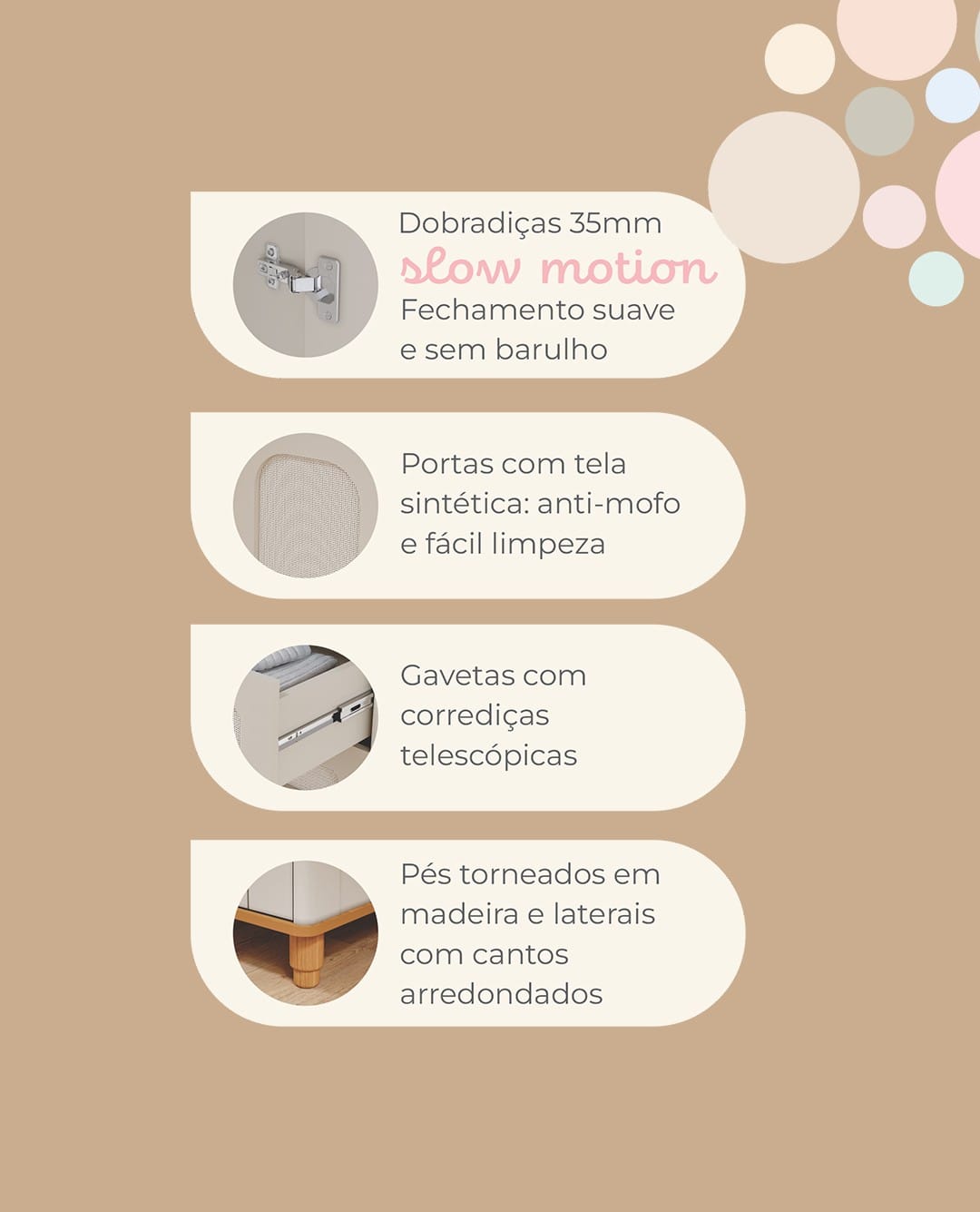 Largura: 922mm Altura: 960mm Comprimento: 473mm Apresentamos a Cômoda Alfajor, o móvel que une charme, funcionalidade e segurança para o quarto do bebê! Destaques de design e praticidade: Frente de gavetas com tela sintética, que é anti-mofo e fácil de limpar, garantindo maior cuidado com as roupas do bebê. Cantos arredondados, trazendo mais segurança e um toque delicado ao design. Puxadores e pés torneados em madeira, que agregam um charme clássico e elegante ao ambiente. Funcionalidade e segurança: Gavetas com corrediças telescópicas, para um deslizamento suave e prático no dia a dia. Kit anti tombamento, proporcionando maior estabilidade e segurança, especialmente nos primeiros anos. A Cômoda Alfajor é perfeita para mães que buscam um móvel que une organização, beleza e cuidado em cada detalhe, criando um espaço acolhedor e funcional para o bebê.