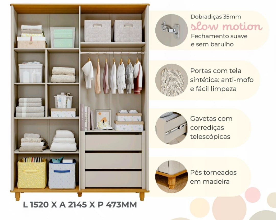 – Alt: 2100 mm – Larg: 1272 mm – Prof: 450 mm – Produto 100% MDF – Pintura atóxica – Pintura branca em escala brilho – Pintura amêndoa em escala semibrilho – Acabamento interno em pintura textura linho – Pés usinados em peça maciça de MDF 25 mm – Puxadores em MDF revestido – Cabideiro metálico – Corrediças telescópicas