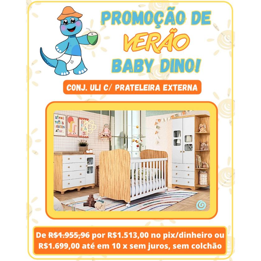 O conjunto pode ser todo branco ou branco com amêndoa (madeira). CARACTERÍSTICAS DO BERÇO BEN: – 100% MDF; – Pintura atóxica; – Bordas laqueadas; – Berço padrão americano; – Suporte cortinado incluso; – Pintura branca em escala brilho; – 3 em 1: vira minicama ou minisofá; – Base do colchão c/ 2 opções de altura; – Pintura amêndoa em escala semibrilho. Medidas do berço: Altura: 97 cm; Comprimento: 132 cm; Largura ou produndidade: 76 cm. CARACTERÍSTICAS DO ARMÁRIO ULI C/ 03 PORTAS: – 100% MDF; – Pés em ABS; – Cabideiro metálico; – Puxadores em ABS; – 2 opções de rodapé; – Corrediças telescópicas; – Portas com PETG cristal; – Sistema antitombamento. Medidas do armário: Altura: 189 cm; Largura: 92 cm; Produndidade: 42 cm. CARACTERÍSTICAS DA CÔMODA ULI: – 100% MDF; – Cabideiro metálico; – Puxadores em ABS; – Pés em ABS inclusos; – Porta com PETG cristal; – Corrediças telescópicas; – Sistema antitombamento; – Tampo com bordas laqueadas. Medidas da cômoda: Altura: 88 cm; Largura: 95 cm; Produndidade: 42 cm.