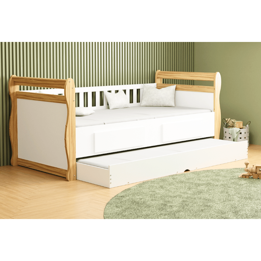 A cama Maria Bibox pode ser na cor branca ou branco com amêndoa (madeira).