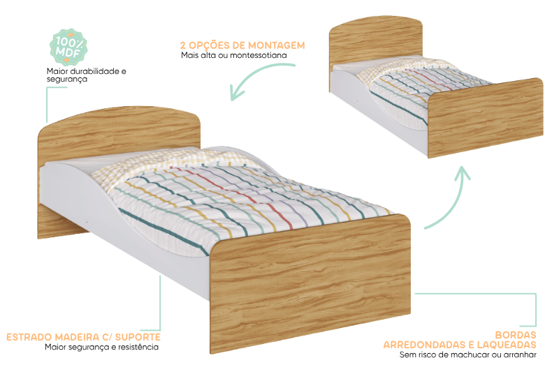 A cama Lua pode ser na cor branca ou branco com amêndoa (madeira). CARACTERÍSTICAS DA CAMA LUA: – 100% MDF; – Pintura atóxica; – Bordas arredondadas; – Cama com estrados de madeira; – Altura alta ou montessoriana; – Pintura branca em escala brilho; – Pintura amêndoa em escala semibrilho. Medidas da cama Lua: Largura: 193 cm; Altura: 66 cm; Profundidade: 96 cm.