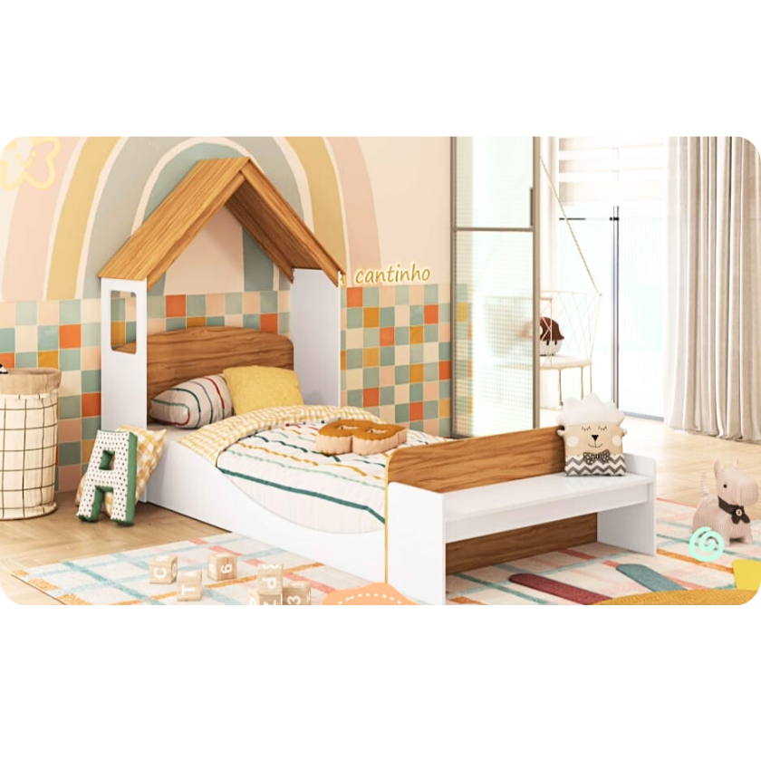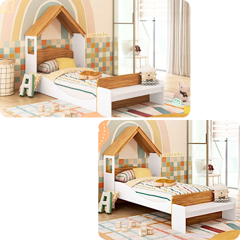 A cama Lua c/ o kit casinha pode ser toda branca ou branco com amêndoa (madeira). O kit casinha é composto de 01 casinha e 01 banco. O kit casinha pode ser montado como cabeceira da cama Lua ou como uma escrivaninha. CARACTERÍSTICAS DA CAMA LUA: – 100% MDF; – Pintura atóxica; – Bordas arredondadas; – Cama com estrados de madeira; – Altura alta ou montessoriana; – Pintura branca em escala brilho; – Pintura amêndoa em escala semibrilho. Medidas da cama Lua: Largura: 193 cm; Altura: 66 cm; Profundidade: 96 cm. CARACTERÍSTICAS DO KIT CASINHA: – 100% MDF; – Pintura atóxica; – 2 EM 1: Cabeceira com banquinho ou Escrivaninha com banquinho. Medidas do kit casinha: Largura: 102 cm; Altura: 141 cm; Profundidade: 41 cm.