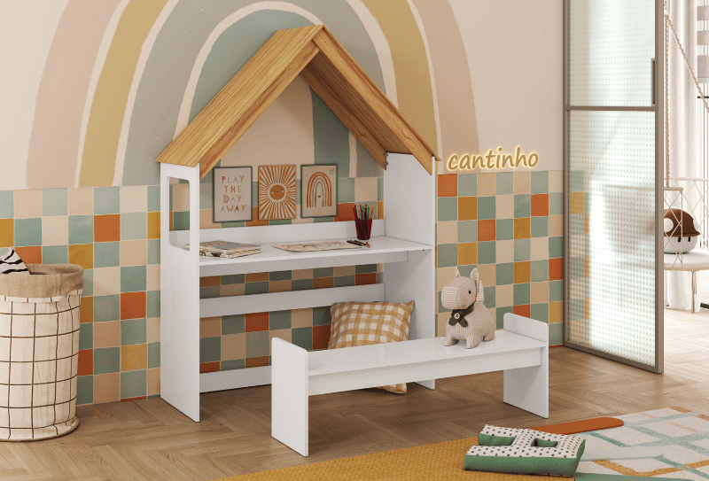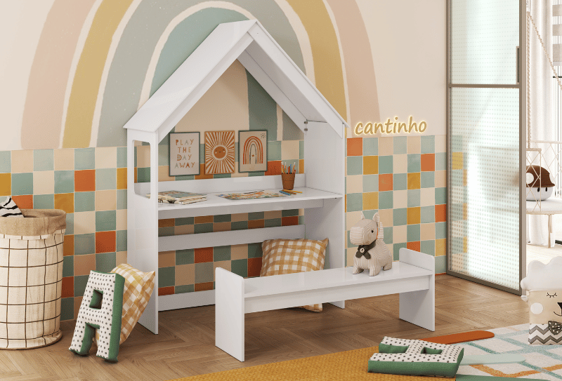 O kit casinha é composto de 01 casinha e 01 banco. O kit casinha pode ser montado como cabeceira da cama Lua ou como uma escrivaninha.