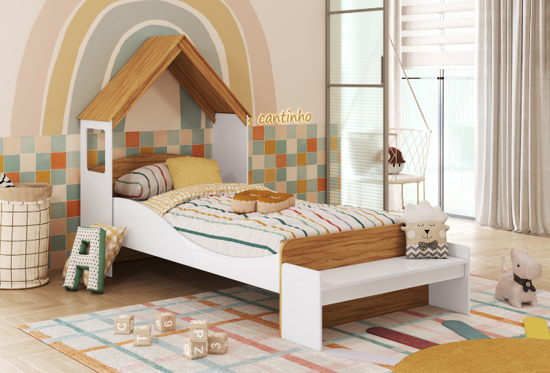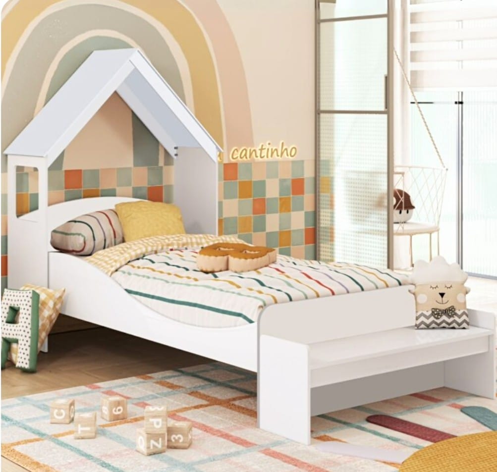 A cama Sol c/ o kit casinha (casinha e banco) pode ser na cor branca ou branco com amêndoa (madeira). A cama Sol c/ o kit casinha pode ser montada sem os pés, no chão, ou pode ser montada com os pés, no alto. O kit casinha pode ser montado como cabeceira da cama Sol ou como uma escrivaninha. CARACTERÍSTICAS DO KIT CASINHA: – 100% MDF; – Pintura atóxica; – 2 EM 1: Cabeceira com banquinho ou Escrivaninha com banquinho. Medidas do kit casinha: Largura: 102 cm; Altura: 141 cm; Profundidade: 41 cm. CARACTERÍSTICAS DA CAMA SOL: – 100% MDF; – Pintura atóxica; – Pés em MDF; – Bordas arredondadas; – Cama com estrados de madeira; – Suporte de apoio para o estrado; – Pintura branca em escala brilho; – Pintura amêndoa em escala semibrilho. Medidas da cama Sol: Largura: 193 cm; Altura: 64 cm; Profundidade: 96 cm.