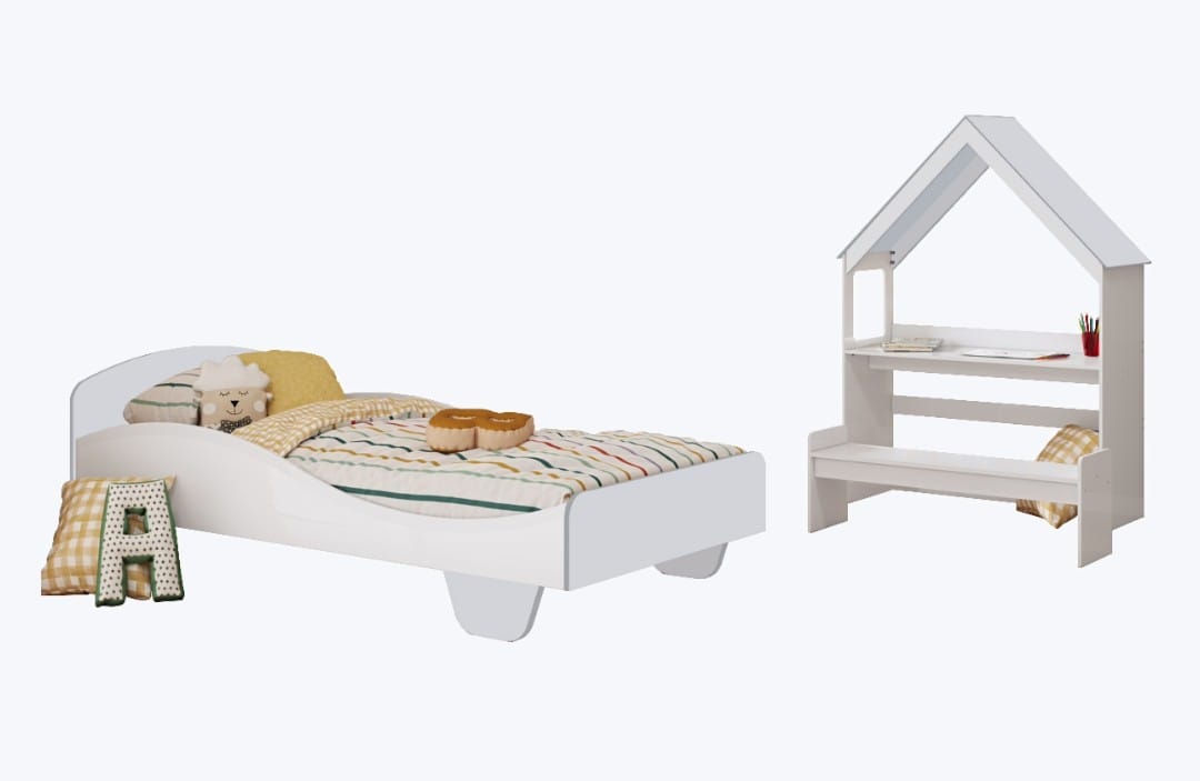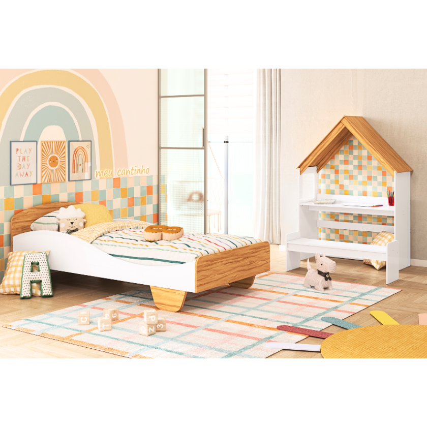 A cama Lua c/ o kit casinha pode ser toda branca ou branco com amêndoa (madeira). O kit casinha é composto de 01 casinha e 01 banco. O kit casinha pode ser montado como cabeceira da cama Lua ou como uma escrivaninha. CARACTERÍSTICAS DA CAMA LUA: – 100% MDF; – Pintura atóxica; – Bordas arredondadas; – Cama com estrados de madeira; – Altura alta ou montessoriana; – Pintura branca em escala brilho; – Pintura amêndoa em escala semibrilho. Medidas da cama Lua: Largura: 193 cm; Altura: 66 cm; Profundidade: 96 cm. CARACTERÍSTICAS DO KIT CASINHA: – 100% MDF; – Pintura atóxica; – 2 EM 1: Cabeceira com banquinho ou Escrivaninha com banquinho. Medidas do kit casinha: Largura: 102 cm; Altura: 141 cm; Profundidade: 41 cm.