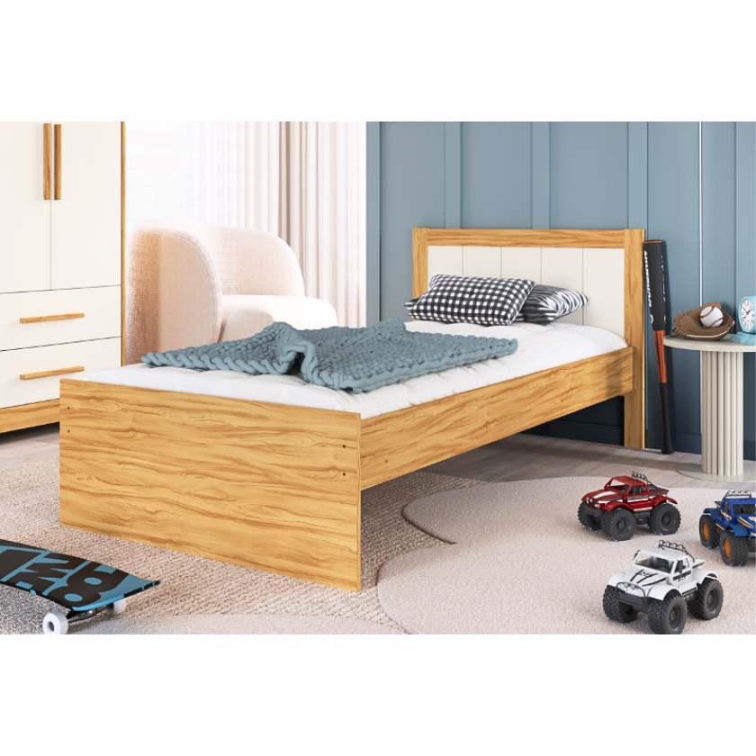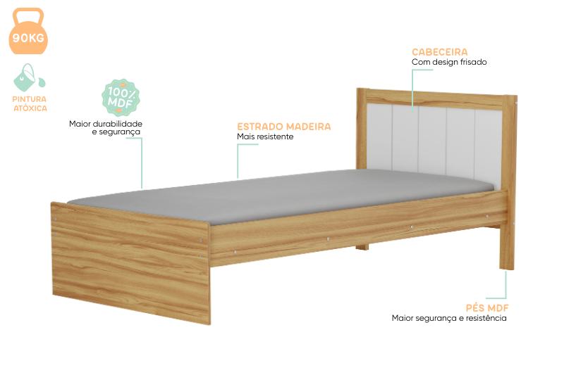 A cama Maria Simples pode ser toda branca ou branco com amêndoa (madeira). CARACTERÍSTICAS DA CAMA MARIA SIMPLES: – 100% MDF; – Pintura atóxica; – Bordas laqueadas; – Cama com estrados de madeira; – Pintura branca em escala brilho; – Kit capitonê (vendido separadamente); – Pintura amêndoa em escala semibrilho; – Cama auxiliar simples (vendida separadamente). Medidas Altura: 90 cm; Largura: 210 cm; Profundidade: 95 cm.