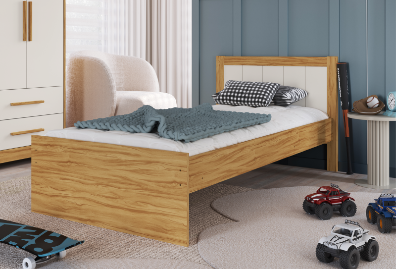 A cama Manu pode ser toda branca ou branco com amêndoa (madeira).