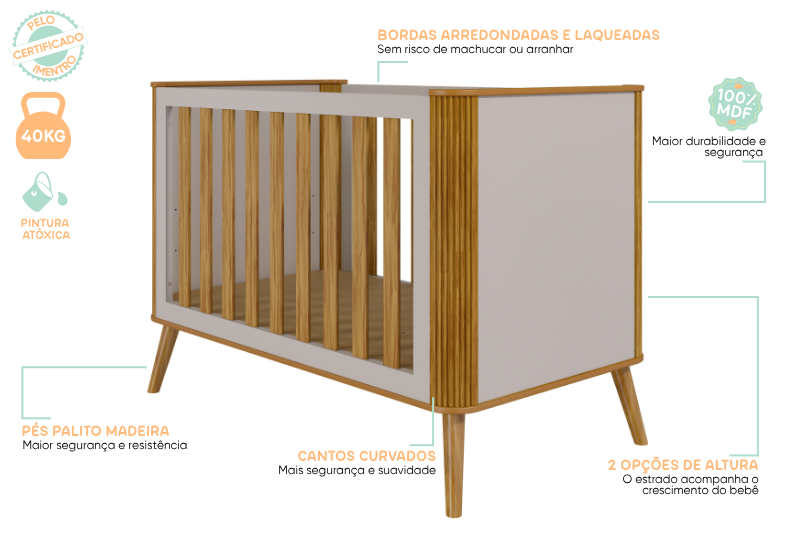 Berço padrão americano, 100% MDF. Base do colchão construída em MDF e madeira, com três opções de regulagem de altura. Pintura atóxica, sendo as faces das peças em pintura UV e as bordas em Pintura PU. Todas as bordas acessíveis arredondadas. Varal para mosquiteiro incluso. Quatro rodízios, sendo 02 com travas. Altura: 1195 mm Largura: 1490 mm Profundidade: 788 mm Opção de transformação em minicama e minisofá.