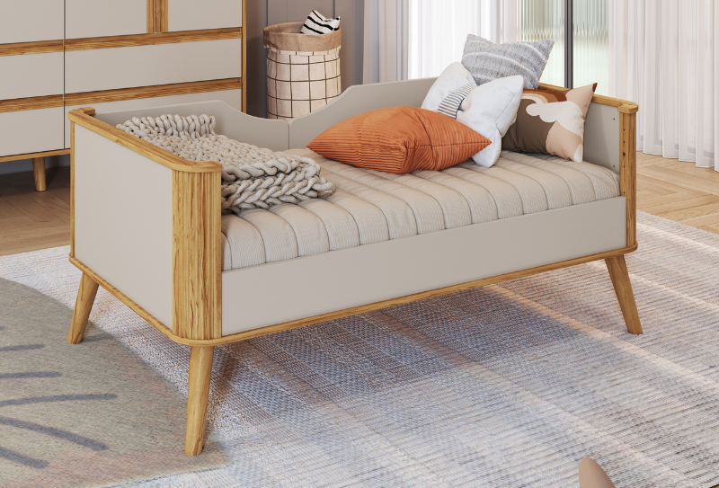 Largura: 135cm Altura: 94cm Profundidade: 76cm 100% MDF Pintura atóxica Bordas laqueadas Bordas laqueadas Detalhe botão na moldura Suporte cortinado incluso Pintura branca em escala brilho Pintura amêndoa em escala semibrilho 4 em 1: vira minicama ou escrivaninha ou minisofá
