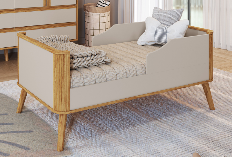 Largura: 133cm Altura: 95cm Profundidade: 76cm 100% MDF Pintura atóxica Bordas laqueadas Berço padrão americano Suporte cortinado incluso Pintura branca em escala brilho 3 em 1: vira minicama ou minisofá Base do colchão c/ 2 opções de altura Pintura amêndoa em escala semibrilho