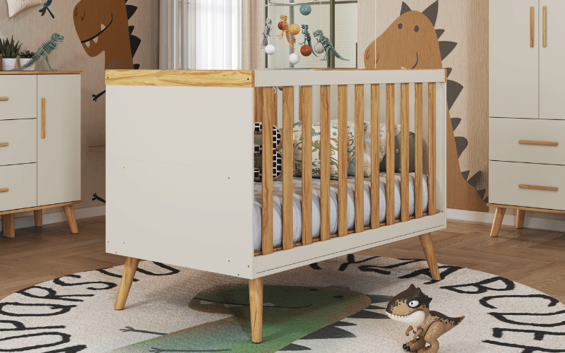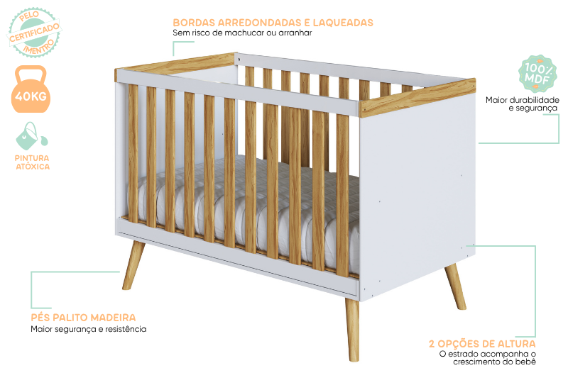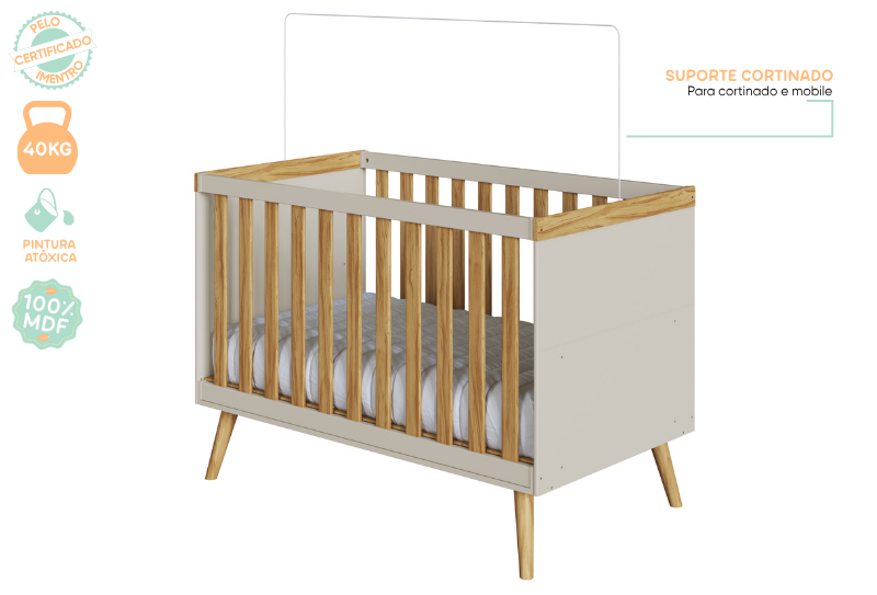 Berço padrão americano, 100% MDF. Base do colchão construída em MDF e madeira, com três opções de regulagem de altura. Pintura atóxica, sendo as faces das peças em pintura UV e as bordas em Pintura PU. Todas as bordas acessíveis arredondadas. Varal para mosquiteiro incluso. Quatro rodízios, sendo 02 com travas. Altura: 1195 mm Largura: 1490 mm Profundidade: 788 mm Opção de transformação em minicama e minisofá.