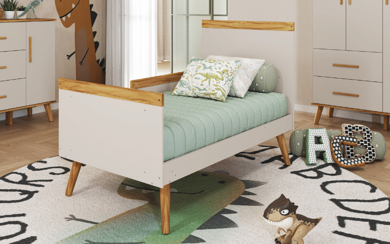 Largura: 133cm Altura: 95cm Profundidade: 76cm 100% MDF Pintura atóxica Bordas laqueadas Berço padrão americano Suporte cortinado incluso Pintura branca em escala brilho 3 em 1: vira minicama ou minisofá Base do colchão c/ 2 opções de altura Pintura amêndoa em escala semibrilho