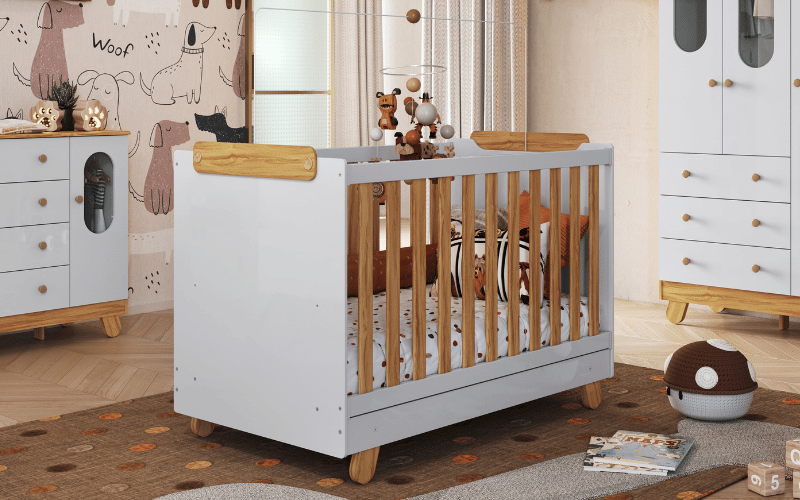 O Berço Retrô Peroba Móveis tem o Padrão Americano e a possibilidade de virar uma mini cama. Possui varal para mosquiteiro incluso e está disponível nas cores Branco Brilho, Branco Brilho/Carvalho e Branco/Cinza. Berço Padrão Americano O Berço tem a possibilidade de virar mini cama Base do colchão com 03 opções de altura Varal para mosquiteiro incluso Revestimento em tecido Courino Branco ou tecido Suede Disponível nas cores Branco Brilho e Branco com Carvalho Medidas Altura: 960 mm Largura: 1400 mm Profundidade: 763 mm