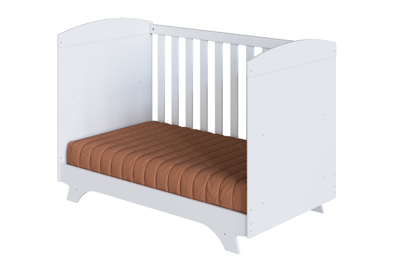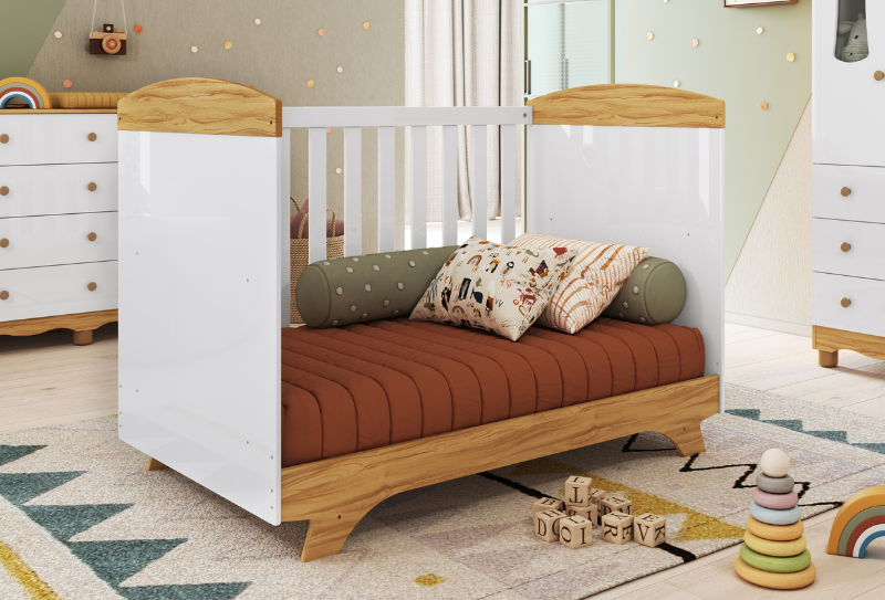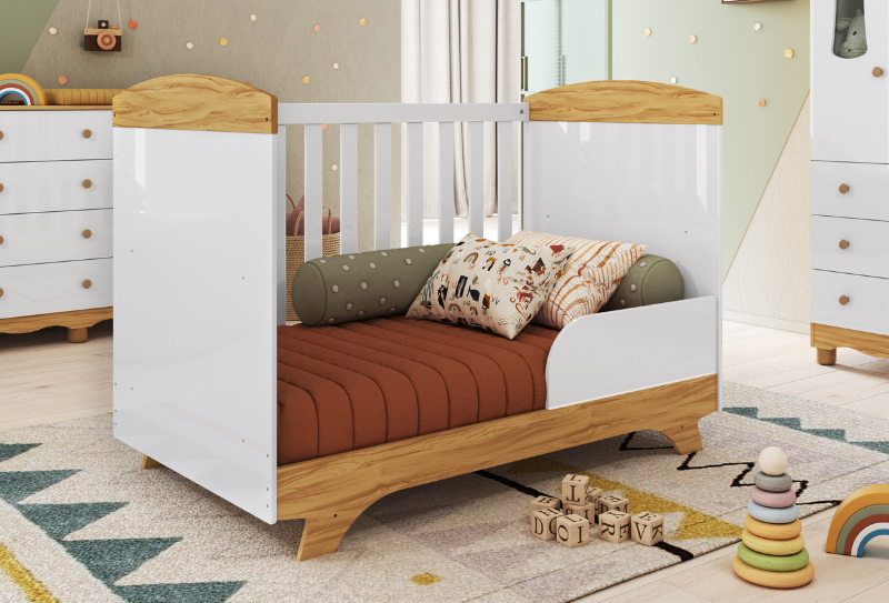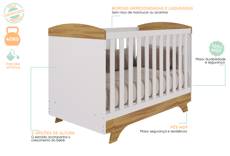 Berço padrão americano, 100% MDF. Base do colchão construída em MDF e madeira, com três opções de regulagem de altura. Pintura atóxica, sendo as faces das peças em pintura UV e as bordas em Pintura PU. Todas as bordas acessíveis arredondadas. Varal para mosquiteiro incluso. Quatro rodízios, sendo 02 com travas. Altura: 1195 mm Largura: 1490 mm Profundidade: 788 mm Opção de transformação em minicama e minisofá.