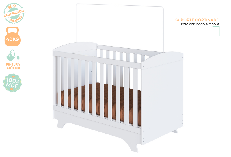 Produto 100% mdf Pintura atóxica Bordas arredondadas e laqueadas Berço padrão americano (colchão 130cm x 70cm x 12cm) Colcão não acompanha Estrado com 02 opções de regulagem de altura Suporte cortinado incluso Produto 3 em 1: berço, minicama e minisofá Certificação Compulsória Portaria inmetro nº 143/2021 ocp 0070 Registro nº 003744/2022 Medidas do móvel montado alt 104cm X larg 132cm X prof 76cm Opções de cor: Branco Brilho ou Branco com Amêndoa
