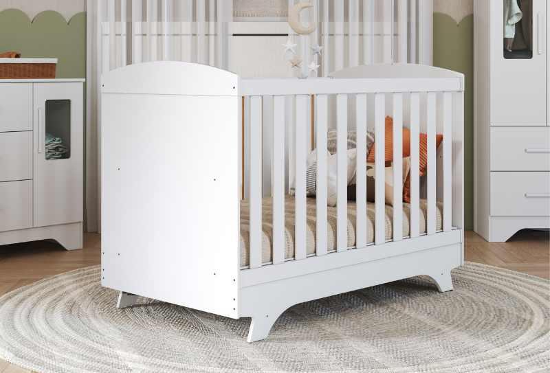 O Berço Retrô Peroba Móveis tem o Padrão Americano e a possibilidade de virar uma mini cama. Possui varal para mosquiteiro incluso e está disponível nas cores Branco Brilho, Branco Brilho/Carvalho e Branco/Cinza. Berço Padrão Americano O Berço tem a possibilidade de virar mini cama Base do colchão com 03 opções de altura Varal para mosquiteiro incluso Revestimento em tecido Courino Branco ou tecido Suede Disponível nas cores Branco Brilho e Branco com Carvalho Medidas Altura: 960 mm Largura: 1400 mm Profundidade: 763 mm