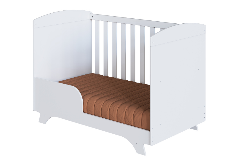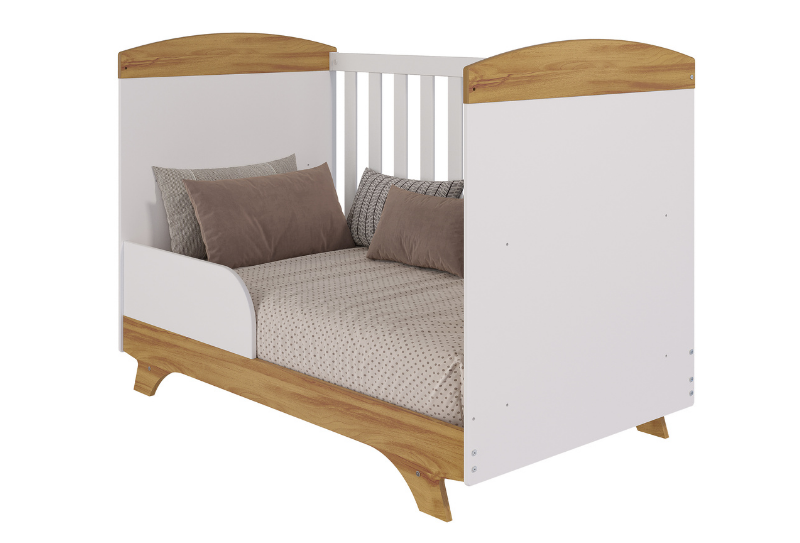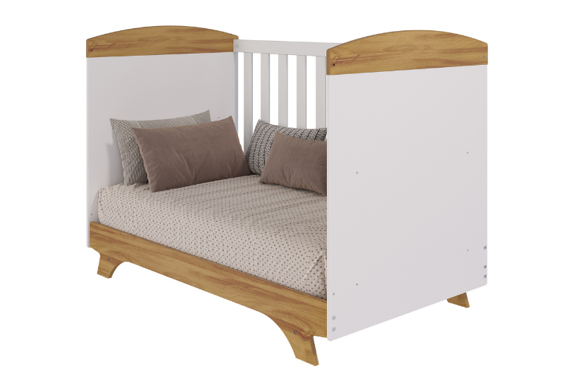 Largura: 132cm Altura: 97cm Profundidade: 76cm 100% MDF Pintura atóxica Bordas laqueadas Berço padrão americano Suporte cortinado incluso Pintura branca em escala brilho 3 em 1: vira minicama ou minisofá Base do colchão c/ 2 opções de altura Pintura amêndoa em escala semibrilho