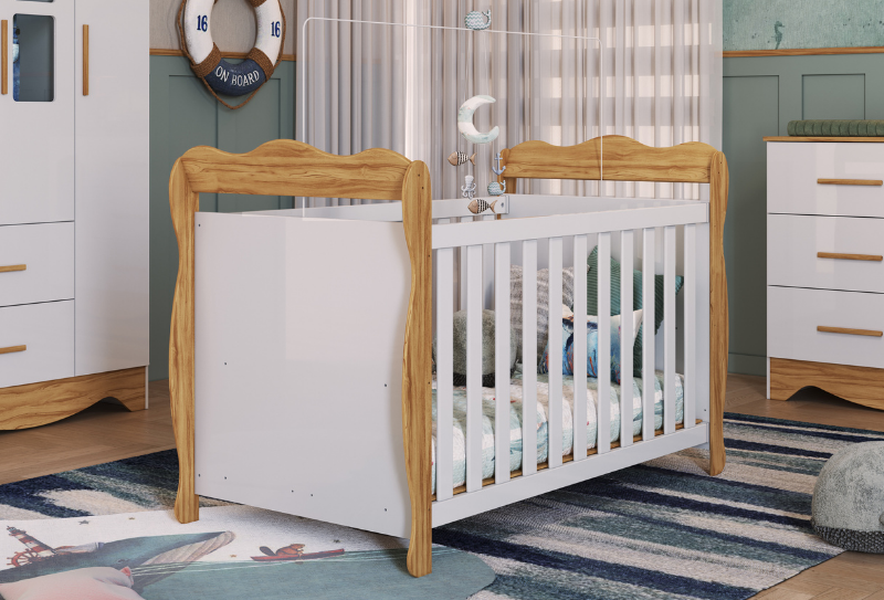 O Berço Retrô Peroba Móveis tem o Padrão Americano e a possibilidade de virar uma mini cama. Possui varal para mosquiteiro incluso e está disponível nas cores Branco Brilho, Branco Brilho/Carvalho e Branco/Cinza. Berço Padrão Americano O Berço tem a possibilidade de virar mini cama Base do colchão com 03 opções de altura Varal para mosquiteiro incluso Revestimento em tecido Courino Branco ou tecido Suede Disponível nas cores Branco Brilho e Branco com Carvalho Medidas Altura: 960 mm Largura: 1400 mm Profundidade: 763 mm