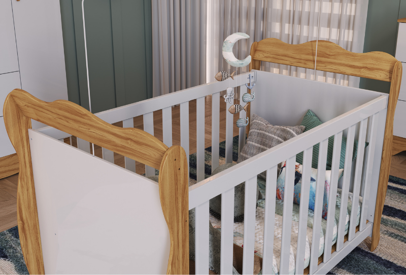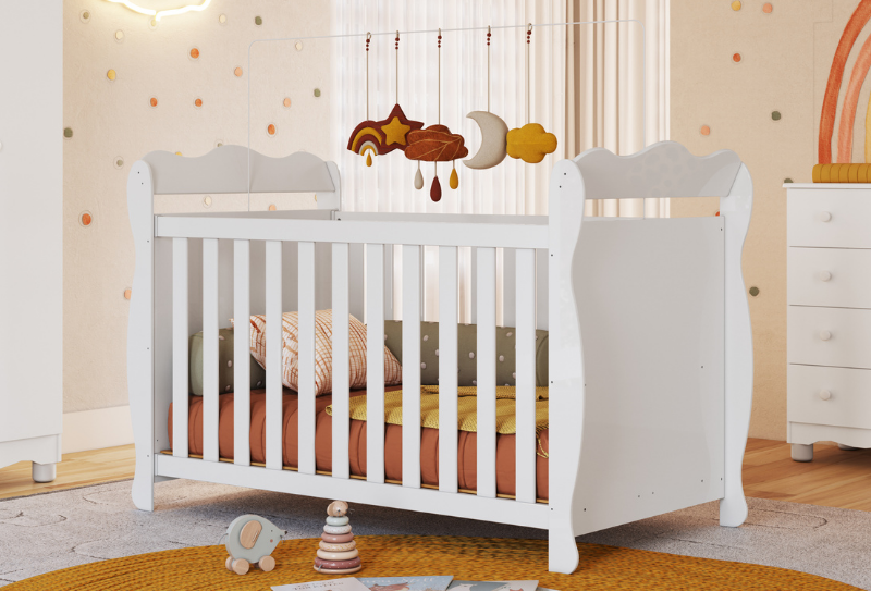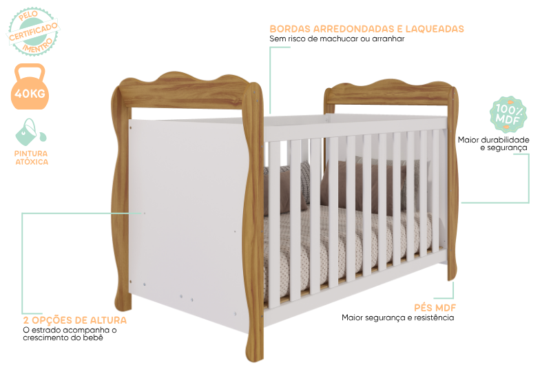 Berço padrão americano, 100% MDF. Base do colchão construída em MDF e madeira, com três opções de regulagem de altura. Pintura atóxica, sendo as faces das peças em pintura UV e as bordas em Pintura PU. Todas as bordas acessíveis arredondadas. Varal para mosquiteiro incluso. Quatro rodízios, sendo 02 com travas. Altura: 1195 mm Largura: 1490 mm Profundidade: 788 mm Opção de transformação em minicama e minisofá.