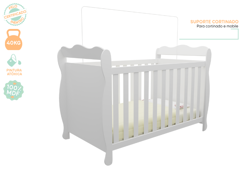 Produto 100% mdf Pintura atóxica Bordas arredondadas e laqueadas Berço padrão americano (colchão 130cm x 70cm x 12cm) Colcão não acompanha Estrado com 02 opções de regulagem de altura Suporte cortinado incluso Produto 3 em 1: berço, minicama e minisofá Certificação Compulsória Portaria inmetro nº 143/2021 ocp 0070 Registro nº 003744/2022 Medidas do móvel montado alt 104cm X larg 132cm X prof 76cm Opções de cor: Branco Brilho ou Branco com Amêndoa
