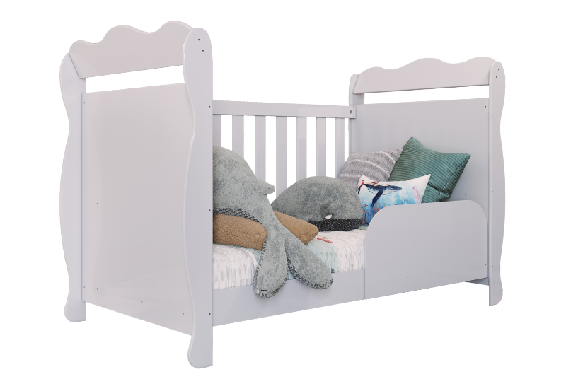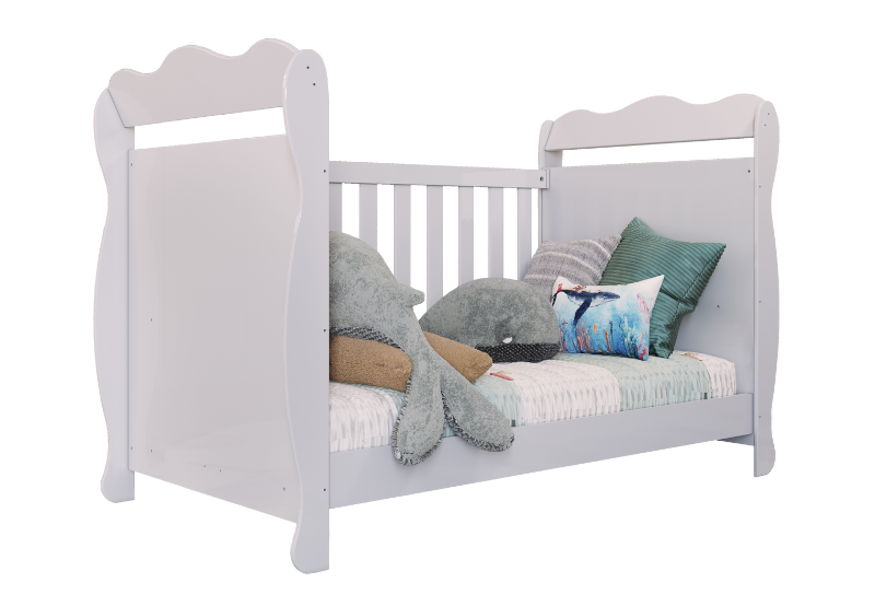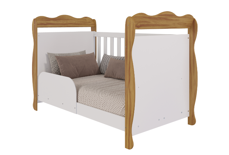 Largura: 132cm Altura: 97cm Profundidade: 76cm 100% MDF Pintura atóxica Bordas laqueadas Berço padrão americano Suporte cortinado incluso Pintura branca em escala brilho 3 em 1: vira minicama ou minisofá Base do colchão c/ 2 opções de altura Pintura amêndoa em escala semibrilho