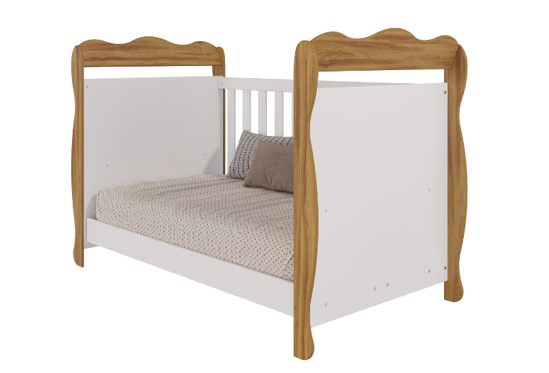 Berço Cloe da Peroba Móveis é feito em 100% MDF, o que garante grande durabilidade. O berço ainda conta com 3 opções de altura para a base do colchão. Berço padrão americano Grade fixa Pode ser transformado em minicama 04 rodízios, sendo 02 com trava Varal para mosquiteiro incluso Disponível na cor Branca, Carvalho e Branco com Carvalho Tamanho de colchão necessário: 1300mm x 700mm, com altura máxima de 120mm Medidas Altura: 1115 mm Largura: 1350 mm Profundidade: 782 mm