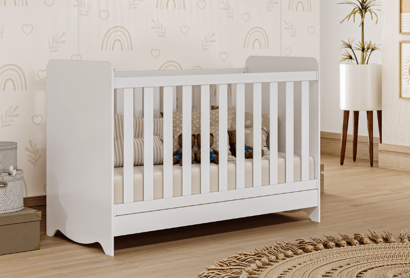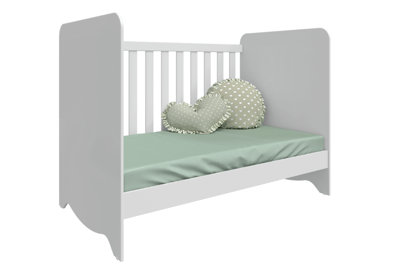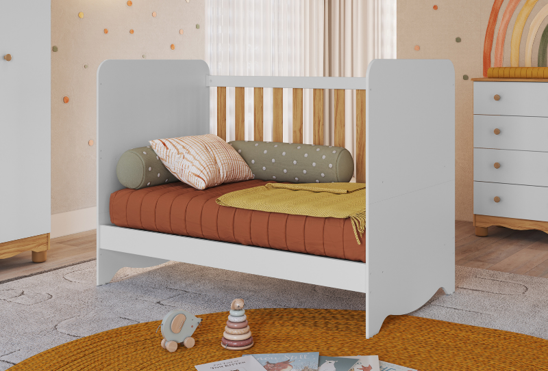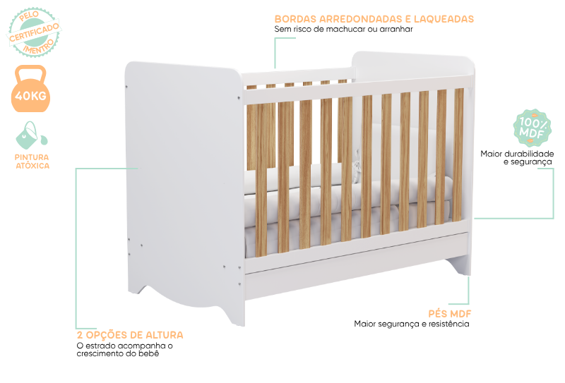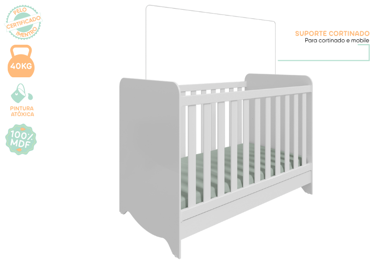 Berço padrão americano, 100% MDF. Base do colchão construída em MDF e madeira, com três opções de regulagem de altura. Pintura atóxica, sendo as faces das peças em pintura UV e as bordas em Pintura PU. Todas as bordas acessíveis arredondadas. Varal para mosquiteiro incluso. Quatro rodízios, sendo 02 com travas. Altura: 1195 mm Largura: 1490 mm Profundidade: 788 mm Opção de transformação em minicama e minisofá.