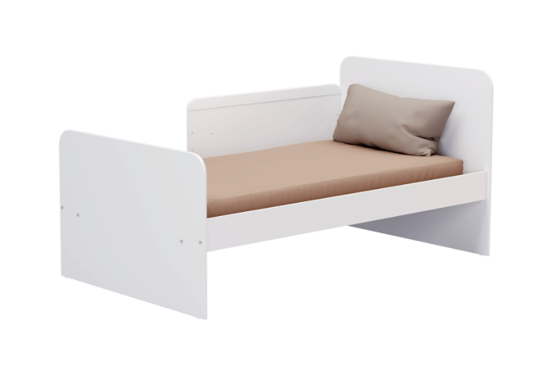 Largura: 148cm Altura: 99cm Profundidade: 78cm 100% MDF Pintura atóxica Bordas laqueadas Berço padrão americano Suporte cortinado incluso Pintura branca em escala brilho 3 em 1: vira minicama ou minisofá Base do colchão c/ 2 opções de altura Pintura amêndoa em escala semibrilho