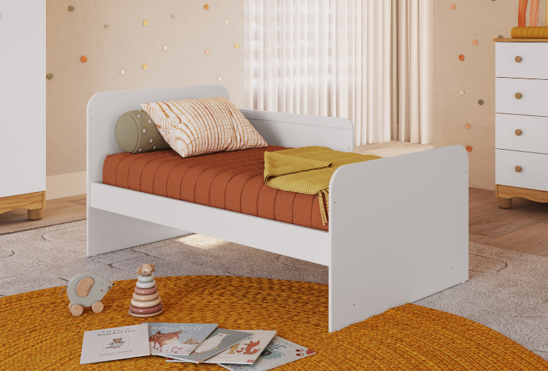 A cama Sol pode ser na cor branca ou branco com amêndoa (madeira). CARACTERÍSTICAS DA CAMA SOL: – 100% MDF; – Pintura atóxica; – Pés em MDF; – Bordas arredondadas; – Cama com estrados de madeira; – Suporte de apoio para o estrado; – Pintura branca em escala brilho; – Pintura amêndoa em escala semibrilho. Medidas da cama Sol: Largura: 193 cm; Altura: 64 cm; Profundidade: 96 cm.