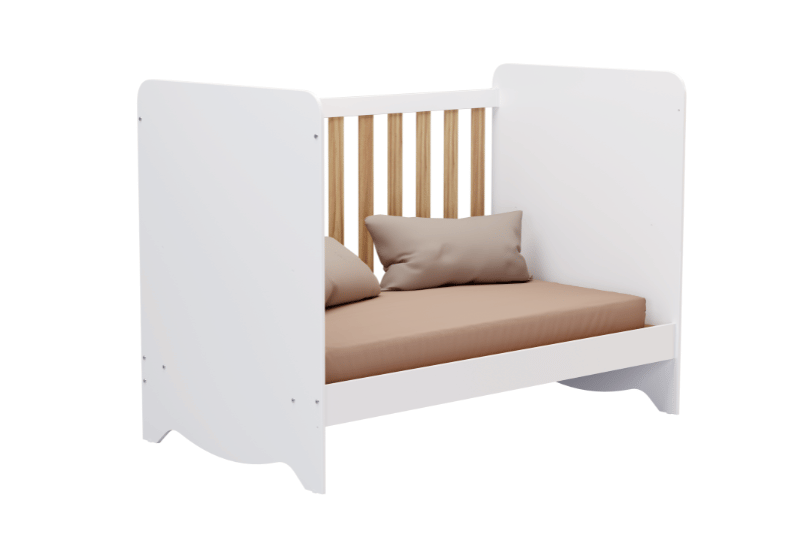 Largura: 133cm Altura: 95cm Profundidade: 76cm 100% MDF Pintura atóxica Bordas laqueadas Berço padrão americano Suporte cortinado incluso Pintura branca em escala brilho 3 em 1: vira minicama ou minisofá Base do colchão c/ 2 opções de altura Pintura amêndoa em escala semibrilho