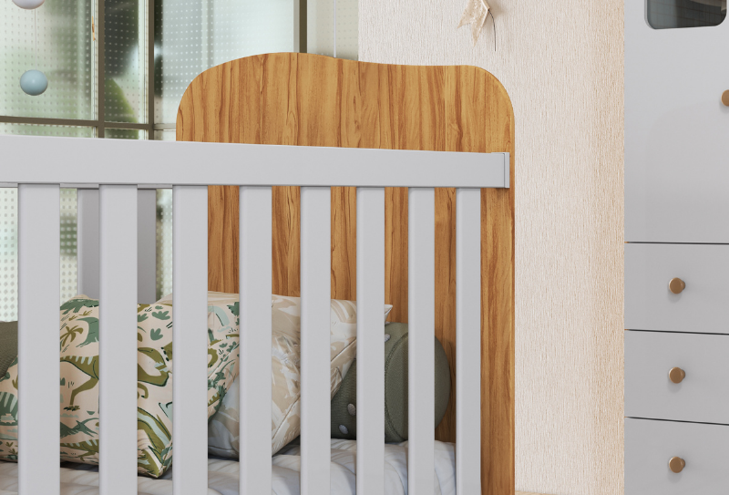 O Berço Retrô Peroba Móveis tem o Padrão Americano e a possibilidade de virar uma mini cama. Possui varal para mosquiteiro incluso e está disponível nas cores Branco Brilho, Branco Brilho/Carvalho e Branco/Cinza. Berço Padrão Americano O Berço tem a possibilidade de virar mini cama Base do colchão com 03 opções de altura Varal para mosquiteiro incluso Revestimento em tecido Courino Branco ou tecido Suede Disponível nas cores Branco Brilho e Branco com Carvalho Medidas Altura: 960 mm Largura: 1400 mm Profundidade: 763 mm