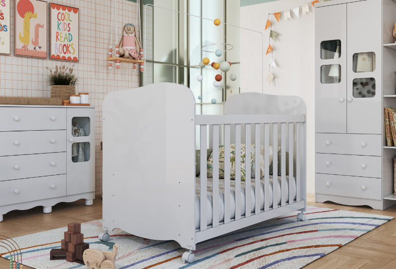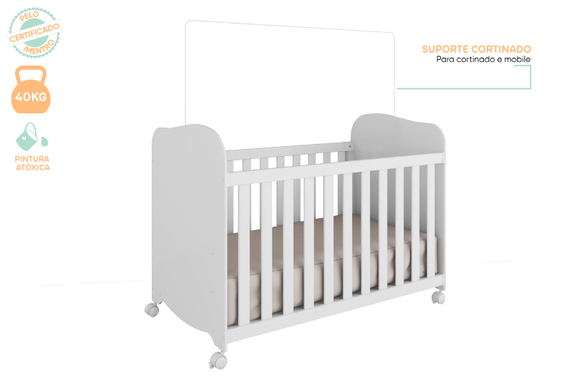 Berço padrão americano, 100% MDF. Base do colchão construída em MDF e madeira, com três opções de regulagem de altura. Pintura atóxica, sendo as faces das peças em pintura UV e as bordas em Pintura PU. Todas as bordas acessíveis arredondadas. Varal para mosquiteiro incluso. Quatro rodízios, sendo 02 com travas. Altura: 1195 mm Largura: 1490 mm Profundidade: 788 mm Opção de transformação em minicama e minisofá.