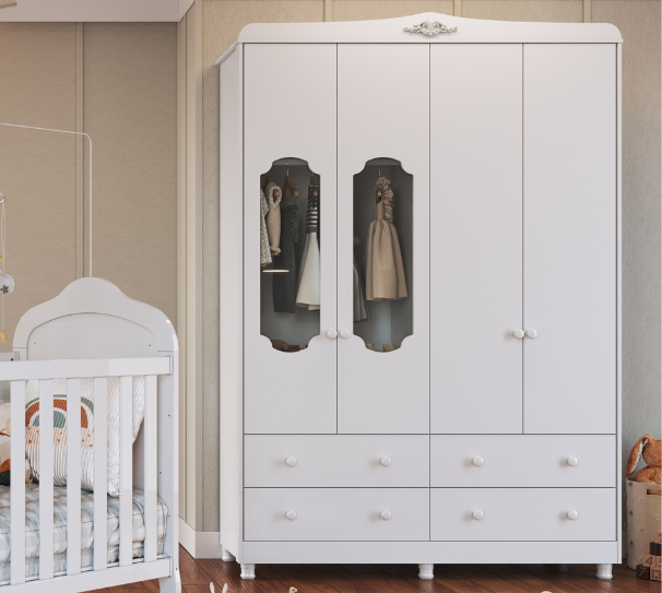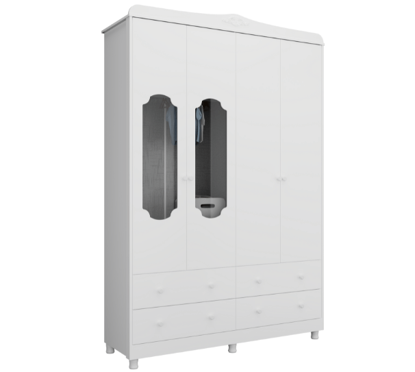 O Armário Tedy 04 Portas Peroba Móveis é feito em 100% MDF e possui um fino acabamento. Seu interior possui várias divisórias, o que o torna muito versátil. Móvel 100% MDF Rodapé reto (já incluso) Rodapé torneado (já incluso) Cabideiro metálico Pixadores plásticos Portas com PETG Cristal Correriças metálicas Disponível nas cores Branco e Branco com Carvalho MEDIDAS Altura: 1885 mm Largura: 1221 mm Profundidade: 415 mm