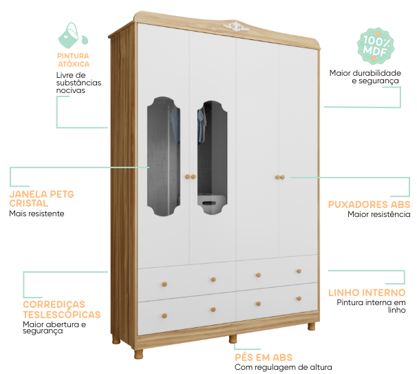 – Alt: 2100 mm – Larg: 1272 mm – Prof: 450 mm – Produto 100% MDF – Pintura atóxica – Pintura branca em escala brilho – Pintura amêndoa em escala semibrilho – Acabamento interno em pintura textura linho – Pés usinados em peça maciça de MDF 25 mm – Puxadores em MDF revestido – Cabideiro metálico – Corrediças telescópicas