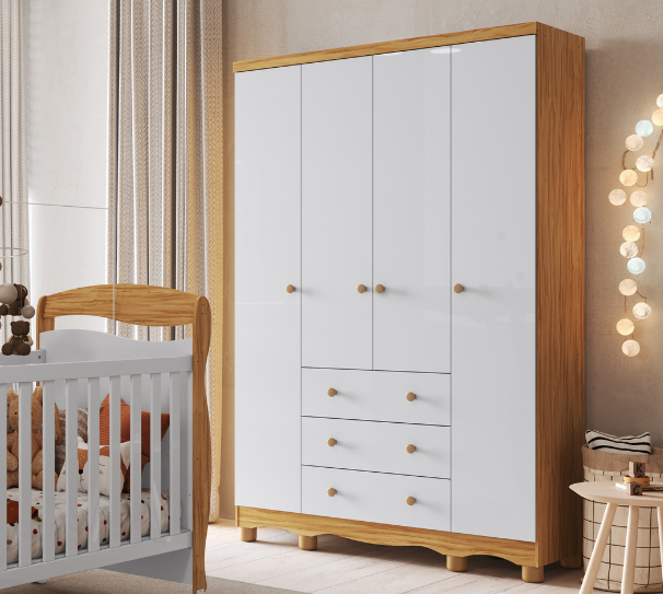 O Armário Retrô 04 Portas Fechado Peroba Móveis e feito em 100% MDF, possui divisória de gavetas opcionais e corrediças telescópicas. O armário está disponível nas cores Branco Brilho, Branco com Carvalho e Branco com Cinza. Produto 100% MDF Divisória de gavetas opcionais, vendidas separadamente Corrediças telescópicas Cabideiros metálicos Puxadores em MDF revestido Disponível nas cores Branco Brilho, Branco Brilho/Carvalho e Branco Brilho/Cinza Medidas Altura: 2096 mm Largura: 1548 mm Profundidade: 498 mm