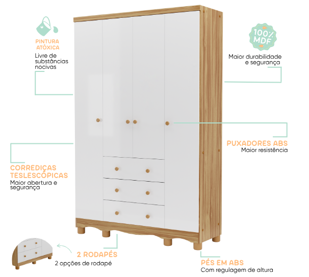 – Alt: 2100 mm – Larg: 1272 mm – Prof: 450 mm – Produto 100% MDF – Pintura atóxica – Pintura branca em escala brilho – Pintura amêndoa em escala semibrilho – Acabamento interno em pintura textura linho – Pés usinados em peça maciça de MDF 25 mm – Puxadores em MDF revestido – Cabideiro metálico – Corrediças telescópicas