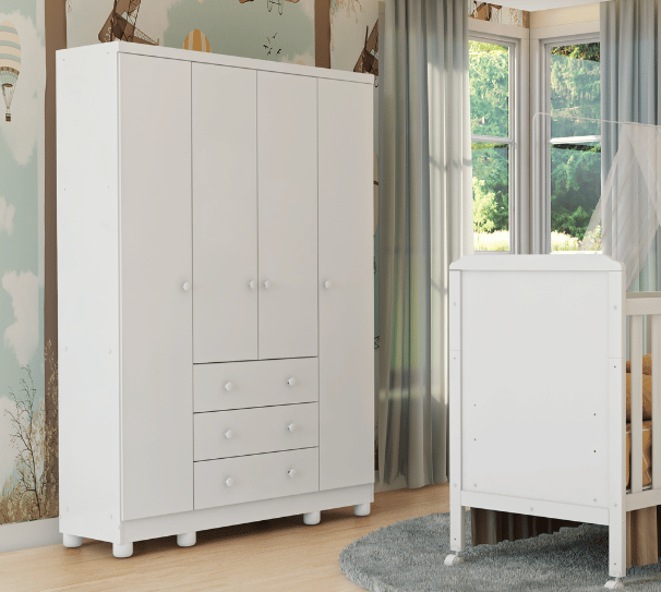 Descrição O kit é composto por; 01 Berço Guti Berço Padrão Americano Fabricado em MDF; Bordas Laqueadas; Pés em MDF; Pode ser transformado em mini cama ,escrivaninha, mini sofa , mesinha. Portaria INMETRO no 143/2021 OCP 0070 Registro no 003742/2022 Medidas do colchão recomendado LARG 0,70cm X COMP 130cm X ALT Máxima 0,12cm; Colchão não acompanha; Medidas do móvel montado ALT 104cm X COMP 138cm X LARG 76cm; 01 Cômoda Guti Fabricado em MDF ; 03 gavetas; 01 porta; Corrediças telescópicas; Tampo com bordas laqueadas; Puxadores em MDF; Pintura atóxica, acabamento brilho; Medidas do móvel montado AL 90cm X LARG 97cm X PROF 45cm; 01 Armário Guti Armário Guti 4 portas ; Produzido em MDF ; corrediças telescópicas; Puxador em MDF; Ótimo espaço interno; Pintura atóxica, acabamento brilho; Medidas do móvel montado ALT 210cm X LARG 127cm X PROF 45cm; Atenção: Por favor, confira as dimensões do produto e certifique-se de que estão adequadas aos elevadores, portas e corredores do local de entrega, pois não fazemos a montagem, desmontagem do produto e/ou portas e janelas, transporte pela escada ou içamento pelo lado de fora do prédio. Montagem e possíveis trocas de peças responsabilidade do comprador; Fabricante Moveis Peroba; Garantia 3 meses contra defeito de fabricação.
