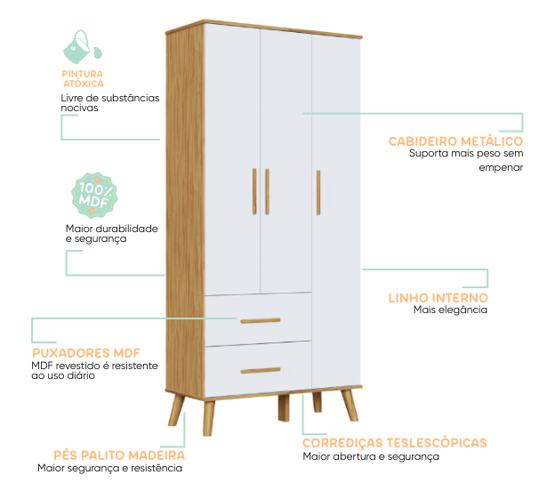 – Alt: 2100 mm – Larg: 1272 mm – Prof: 450 mm – Produto 100% MDF – Pintura atóxica – Pintura branca em escala brilho – Pintura amêndoa em escala semibrilho – Acabamento interno em pintura textura linho – Pés usinados em peça maciça de MDF 25 mm – Puxadores em MDF revestido – Cabideiro metálico – Corrediças telescópicas
