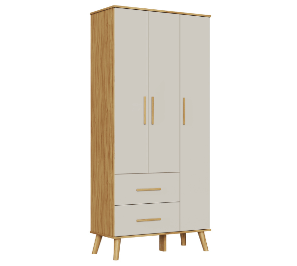 Largura: 93cm Altura: 199cm Profundidade: 42cm 100% MDF Linho interno Cabideiros metálicos Sistema antitombamento Corrediças telescópicas Puxadores em MDF Revestido Pés palito em madeira maciça