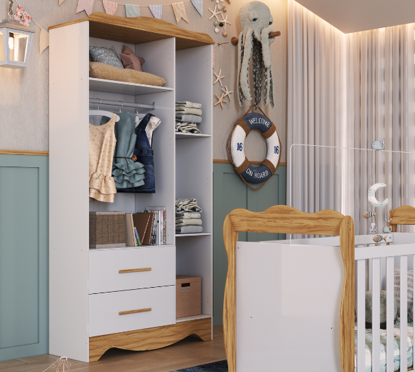 O conjunto Charlô pode ser sem janela ou com janela e pode ser todo branco ou branco com amêndoa (madeira). CARACTERÍSTICAS DO BERÇO CRIS RETRÔ: – 100% MDF; – Pintura atóxica; – Bordas laqueadas; – Berço padrão americano; – Suporte cortinado incluso; – Pintura branca em escala brilho; – 3 em 1: vira minicama ou minisofá; – Base do colchão c/ 2 opções de altura; – Pintura amêndoa em escala semibrilho. Medidas do berço Cris Retrô: Altura: 95 cm. Comprimento: 133 cm; Largura ou profundidade: 70 cm. CARACTERÍSTICAS DO ARMÁRIO CHARLÔ SEM JANELAS: – 100% MDF; – Linho interno; – Pés em ABS inclusos; – Cabideiros metálicos; – Corrediças telescópicas; – Portas com PETG cristal; – Sistema antitombamento; – Puxadores em MDF revestido; – Molduras laterais em MDF revestido. Medidas do armário Charlô: Altura: 218,5 cm. Largura: 157 cm; Profundidade: 50 cm. CARACTERÍSTICAS DA CÔMODA CHARLÔ SEM JANELAS: – 100% MDF; – Cabideiro metálico; – Corrediças telescópicas; – Sistema antitombamento; – Puxadores em MDF revestido; – Tampo com bordas laqueadas; – Pés reguláveis em ABS inclusos; – Molduras laterais em MDF revestido. Medidas da cômoda Charlô: Altura: 103 cm. Largura: 120 cm; Profundidade: 50 cm.