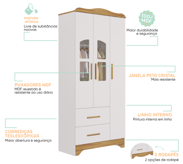 – Alt: 2100 mm – Larg: 1272 mm – Prof: 450 mm – Produto 100% MDF – Pintura atóxica – Pintura branca em escala brilho – Pintura amêndoa em escala semibrilho – Acabamento interno em pintura textura linho – Pés usinados em peça maciça de MDF 25 mm – Puxadores em MDF revestido – Cabideiro metálico – Corrediças telescópicas