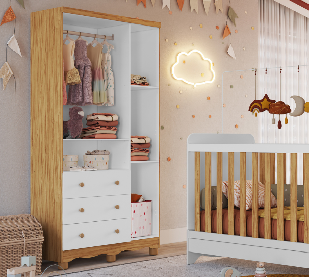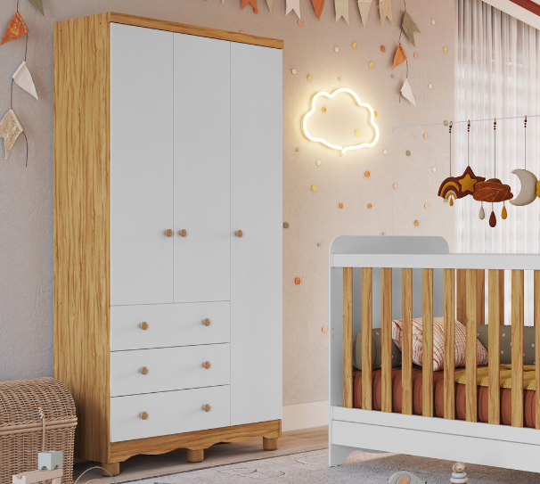 O conjunto pode ser todo branco ou branco com amêndoa (madeira). CARACTERÍSTICAS DO BERÇO BEN: – 100% MDF; – Pintura atóxica; – Bordas laqueadas; – Berço padrão americano; – Suporte cortinado incluso; – Pintura branca em escala brilho; – 3 em 1: vira minicama ou minisofá; – Base do colchão c/ 2 opções de altura; – Pintura amêndoa em escala semibrilho. Medidas do berço: Altura: 97 cm; Comprimento: 132 cm; Largura ou produndidade: 76 cm. CARACTERÍSTICAS DO ARMÁRIO ULI C/ 03 PORTAS: – 100% MDF; – Pés em ABS; – Cabideiro metálico; – Puxadores em ABS; – 2 opções de rodapé; – Corrediças telescópicas; – Portas com PETG cristal; – Sistema antitombamento. Medidas do armário: Altura: 189 cm; Largura: 92 cm; Produndidade: 42 cm. CARACTERÍSTICAS DA CÔMODA ULI: – 100% MDF; – Cabideiro metálico; – Puxadores em ABS; – Pés em ABS inclusos; – Porta com PETG cristal; – Corrediças telescópicas; – Sistema antitombamento; – Tampo com bordas laqueadas. Medidas da cômoda: Altura: 88 cm; Largura: 95 cm; Produndidade: 42 cm.