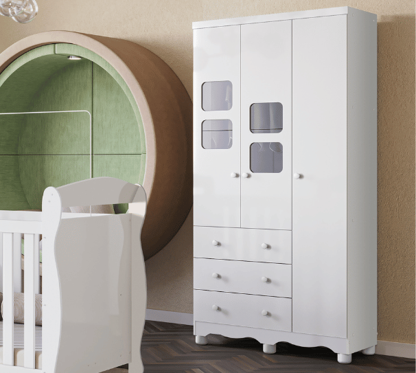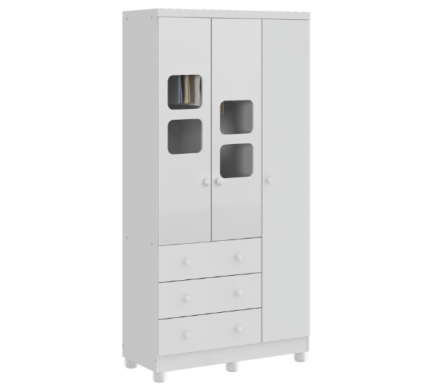 Dimensões(Cm): Comprimento(Profundidade): 76cm x Largura: 133cm x Altura: 95cm CARACTERÍSTICAS DE MÓVEIS Tipo de Estrutura do Móvel - 100% MDF Tipo de Pintura - UV Tipo de Acabamento da Pintura - Semi Brilho - Atóxica Tipo de puxador - MDF Quantidade de Prateleiras - 5 Prateleiras Quantidade de Gavetas - 2 Gavetas Diferenciais da Gaveta - c/ Corrediças Telescópicas Quantidade de Portas - 3 Portas de Abrir Garantia - 3 meses BENEFÍCIOS DE MÓVEIS Certificação de Qualidade de Móveis - Qualidade Aprovada 01 - CARACTERÍSTICAS E BENEFÍCIOS GERAIS Quantidade de Portas - 3 Portas de Abrir Quantidade de Gavetas - 2 Gavetas Quantidade de Prateleiras - 5 Material da Estrutura - MDF Tipo de Pintura - Ultravioleta Garantia - 3 Meses Certificação de Qualidade - Certificação de Qualidade Aprovada 04 - CARACTERÍSTICAS E BENEFÍCIOS DOS MÓVEIS DE QUARTO Tipo de Cabideiro - Aéreo Tamanho do Guarda-Roupa - Infantil