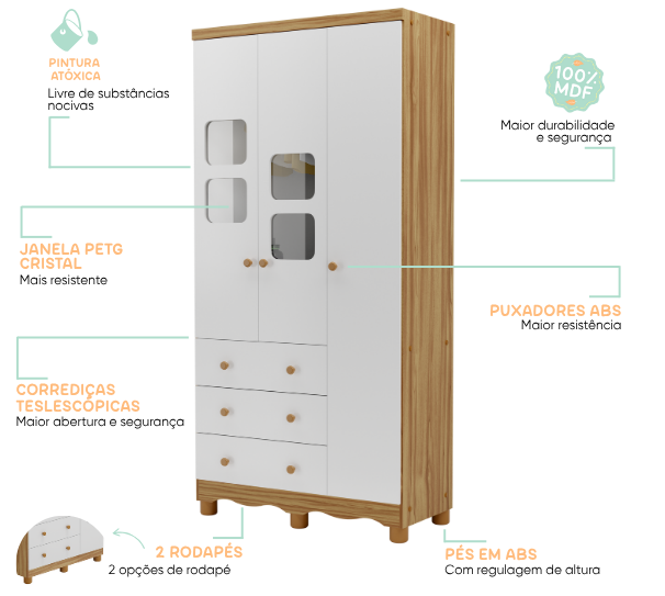 – Alt: 2100 mm – Larg: 1272 mm – Prof: 450 mm – Produto 100% MDF – Pintura atóxica – Pintura branca em escala brilho – Pintura amêndoa em escala semibrilho – Acabamento interno em pintura textura linho – Pés usinados em peça maciça de MDF 25 mm – Puxadores em MDF revestido – Cabideiro metálico – Corrediças telescópicas