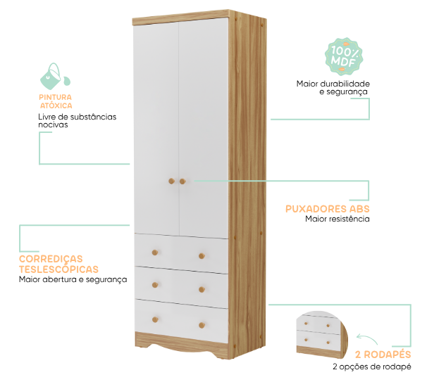 – Alt: 2100 mm – Larg: 1272 mm – Prof: 450 mm – Produto 100% MDF – Pintura atóxica – Pintura branca em escala brilho – Pintura amêndoa em escala semibrilho – Acabamento interno em pintura textura linho – Pés usinados em peça maciça de MDF 25 mm – Puxadores em MDF revestido – Cabideiro metálico – Corrediças telescópicas