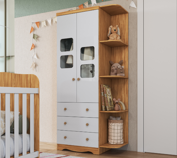 Dimensões(Cm): Comprimento(Profundidade): 76cm x Largura: 133cm x Altura: 95cm CARACTERÍSTICAS DE MÓVEIS Tipo de Estrutura do Móvel - 100% MDF Tipo de Pintura - UV Tipo de Acabamento da Pintura - Semi Brilho - Atóxica Tipo de puxador - MDF Quantidade de Prateleiras - 5 Prateleiras Quantidade de Gavetas - 2 Gavetas Diferenciais da Gaveta - c/ Corrediças Telescópicas Quantidade de Portas - 3 Portas de Abrir Garantia - 3 meses BENEFÍCIOS DE MÓVEIS Certificação de Qualidade de Móveis - Qualidade Aprovada 01 - CARACTERÍSTICAS E BENEFÍCIOS GERAIS Quantidade de Portas - 3 Portas de Abrir Quantidade de Gavetas - 2 Gavetas Quantidade de Prateleiras - 5 Material da Estrutura - MDF Tipo de Pintura - Ultravioleta Garantia - 3 Meses Certificação de Qualidade - Certificação de Qualidade Aprovada 04 - CARACTERÍSTICAS E BENEFÍCIOS DOS MÓVEIS DE QUARTO Tipo de Cabideiro - Aéreo Tamanho do Guarda-Roupa - Infantil