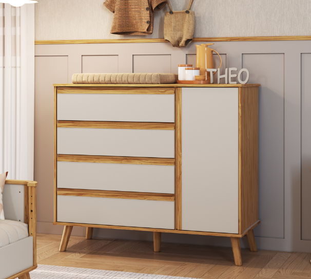 O conjunto Théo só tem na cor off white com amêndoa (madeira). CARACTERÍSTICAS DO BERÇO THÉO (SEM O KIT EVOLUTIVO P/ MINI BERÇO): – 100% MDF; – Pintura atóxica; – Bordas laqueadas; – Berço padrão americano; – Suporte cortinado incluso; – Pés palito em madeira maciça; – Base do colchão c/ 3 opções de altura; – Pintura off white em escala semibrilho; – Pintura amêndoa em escala semibrilho; – Cantos em curvas com detalhe canelado; – Berço 3 em 1: berço, minisofá e minicama. Medidas do berço Théo: Altura: 95 cm; Comprimento: 135,5 cm; Profundidade: 76 cm. CARACTERÍSTICAS DO ARMÁRIO THÉO: 100% MDF; Linho interno; Cabideiros metálicos; Sistema antitombamento; Corrediças telescópicas; Pintura amêndoa x off white; Pés palitos em madeira maciça; Portas com dobradiças slow motion; Puxadores em MDF revestido tipo Cava. Medidas do armário Théo: Altura: 221 cm; Largura: 156 cm; Profundidade: 50 cm. CARACTERÍSTICAS DA CÔMODA THÉO: – 100% MDF; – Linho interno; – Cabideiros metálicos; – Corrediças telescópicas; – Dobradiças Slow Motion; – Sistema antitombamento; – Pés palitos em madeira maciça; – Puxadores em MDF revestido tipo Cava. Medidas da cômoda Théo: Altura: 103 cm; Largura: 118 cm; Profundidade: 50 cm.