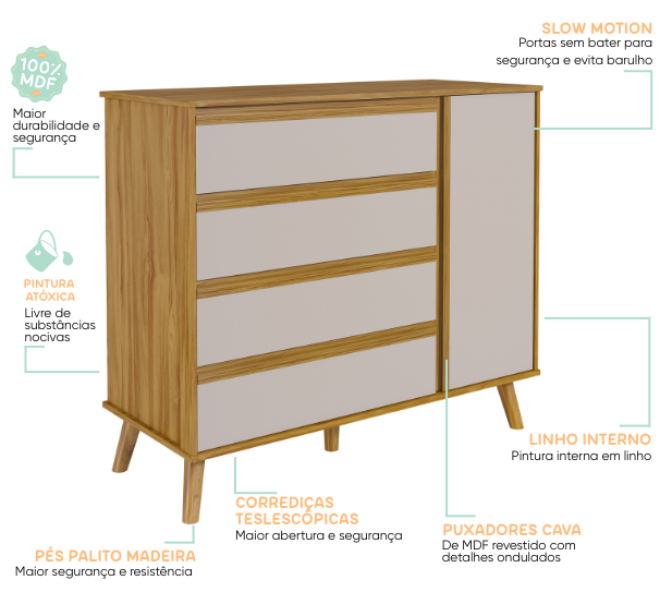 – Alt: 906 mm – Larg: 969 mm – Prof: 450 mm – Pintura atóxica – Pintura branca em escala brilho – Pintura amêndoa em escala semibrilho – Acabamento interno em pintura textura linho – Pés usinados em peça maciça de MDF 25 mm – Puxadores em MDF revestido – Corrediças telescópicas