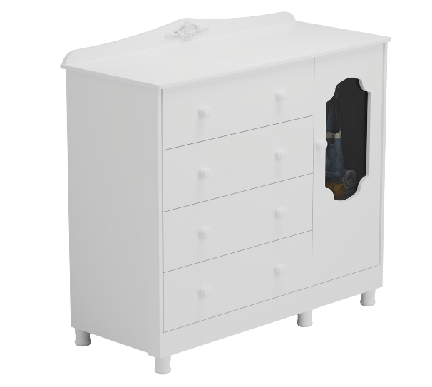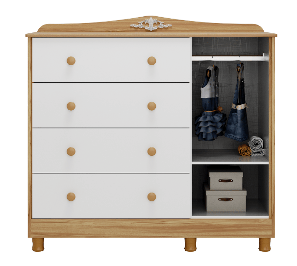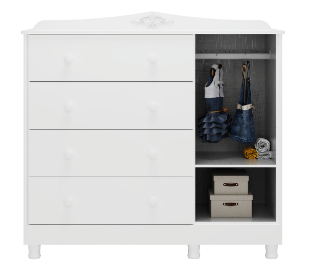 A Cômoda Tedy Peroba Movéis deixa qualquer quarto de bebê lindo com sua pintura laqueada. Produto 100% MDF, disponível nas versões Branco e Branco com Carvalho. Tampo com bordas laqueadas Gavetas com corrediças metálicas Pés plásticos já inclusos Disponível nas versões Branco e Branco com Carvalho. 01 cabideiro e 01 prateleira internos Medidas Altura: 880mm Largura: 953mm Profundidade: 420mm